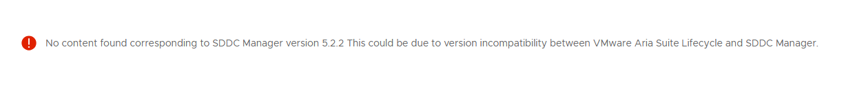 However, this base version does not contain the required content catalog for VCF 5.2.2. As a result, vRSLCM cannot match the correct product bundles and displays the error.