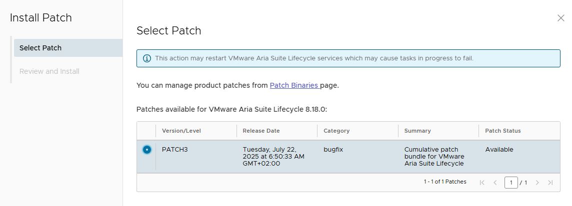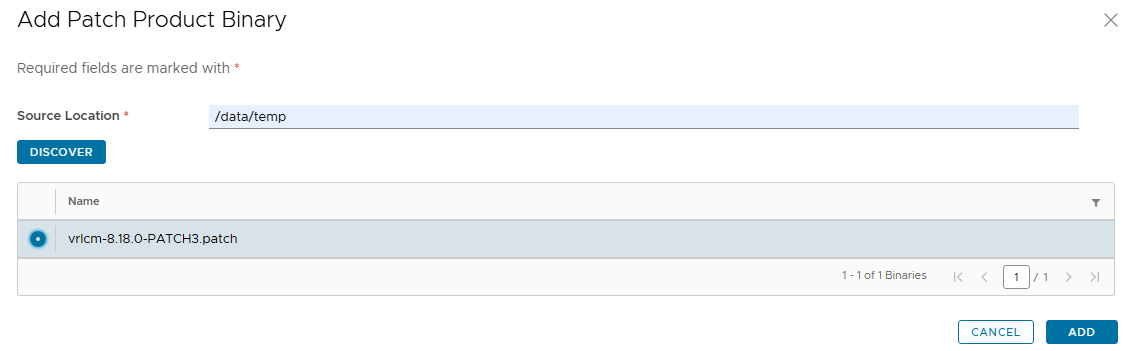 and log into Aria LCM. Navigate to Lifecycle Operations -> Settings -> Binary Mappings -> Patch Binaries tab -> Add Patch Binary -> in Source Location add path /data/temp and click Discover: